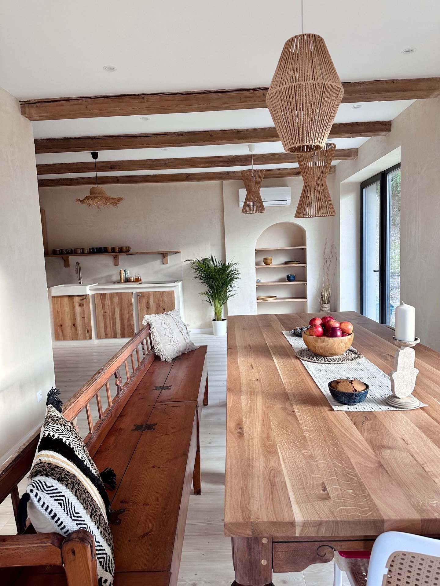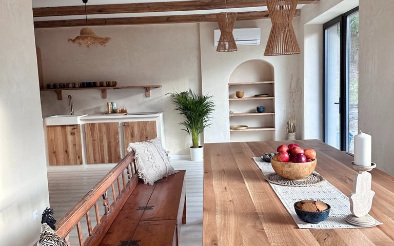 Każdy pokój urządzony jest w stylu boho, z dużą ilością naturalnego drewna i starannie dobranych detali, zapewniając atmosferę komfortu i spokoju.