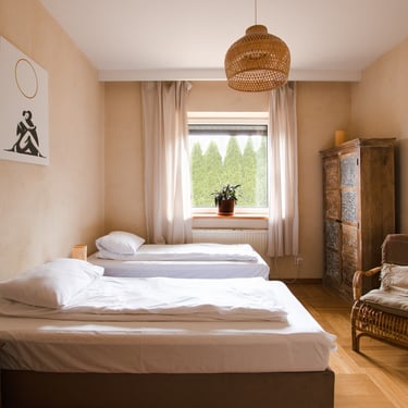 BlissHouse oferuje komfortowe, stylowe pokoje, które zostały zaprojektowane z myślą o wyciszeniu i relaksie naszych gości. Dysponujemy 6 przestronnymi pokojami o unikalnym, kojącym charakterze, mieszczącymi do 20 gości.